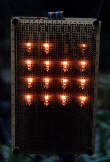 mein 1. lichtobjekt bestand schlicht aus einer platine, auf die 16 kleine glühbirnen gelötet waren. |